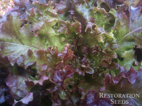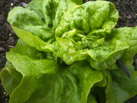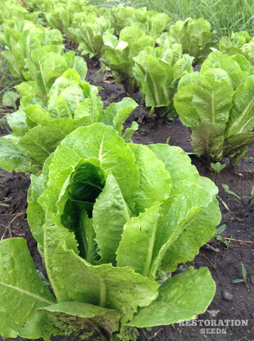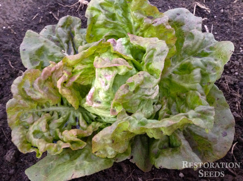 Restoration Seeds Lettuce Variety Trial: 105 days from sowing, started 3/31, transplanted 4/7, photo 7/15, zone 7b. Varieties Top Row: Amish Deer Tongue, Blushed Butter Cos, Brune Percherone (third and fourth off type), Crispino, Green Batavia, Helvius, Kalura. Bottom Row: Little Gem Pearl, Lolla Rossa MT, Mascara, New Red Fire, Red Cash MT, Red Flamingo, Rouge d'Hiver. Least bolt resistant: Blushed Butter Cos, Rouge d'Hiver, Little Gem Pearl. Rest not bolting after 105 days. See individual variety to learn more.