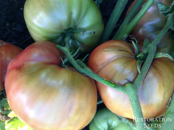 Cherokee Purple and Brandywine cross developed by Keith Mueller of MO. Heavy early producer, 12-20 oz fruit. Matures before red and pink beefsteaks. Tags: Type: Indeterminate, Harvest: Mid, Color: Bi-Colored, Size: Large, Shape: Flat, Specialty: Heavy Producer, Specialty: Potato-leaf, Season: Summer, Certification: Organic.